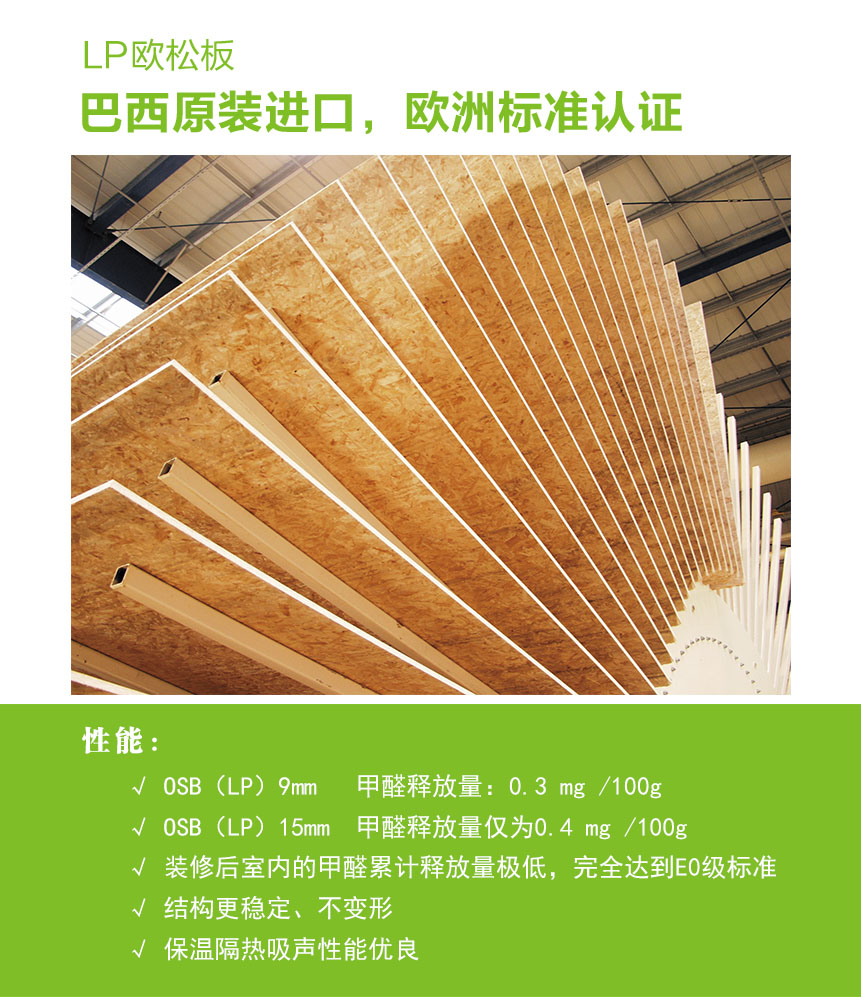 歐松板全部采用高級環(huán)保膠粘劑,符合歐洲最高環(huán)境標準EN300標準,成品完全 符合歐洲E1標準,其甲醛釋放量幾乎為零,可以與天然木材相比,遠遠低于其它板材,是市場上最高等級的裝飾板材,是真正的綠色環(huán)保建材,完全滿足人們對環(huán)保和健康生活的要求。 歐松板的市場價格也與高檔大芯板相當,而無論環(huán)保性能還是物理特性,歐松板都具有可以比較的良好性。其與澳松板相比更接近細木工板。