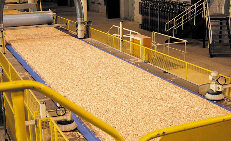 歐松板的原料主要為軟針、闊葉樹材的小徑木、速生間伐材等,如桉樹、杉木、楊木間伐材等,來源比較廣泛,并可制造成大幅面板(如8×32英尺或12×24英尺)。其制造工藝主要是將一定幾何形狀的刨片(通常為長50毫米-80毫米,寬5毫米-20毫米,厚0.45毫米-0.6毫米)經干燥、施膠、定向鋪裝和熱壓成型 。