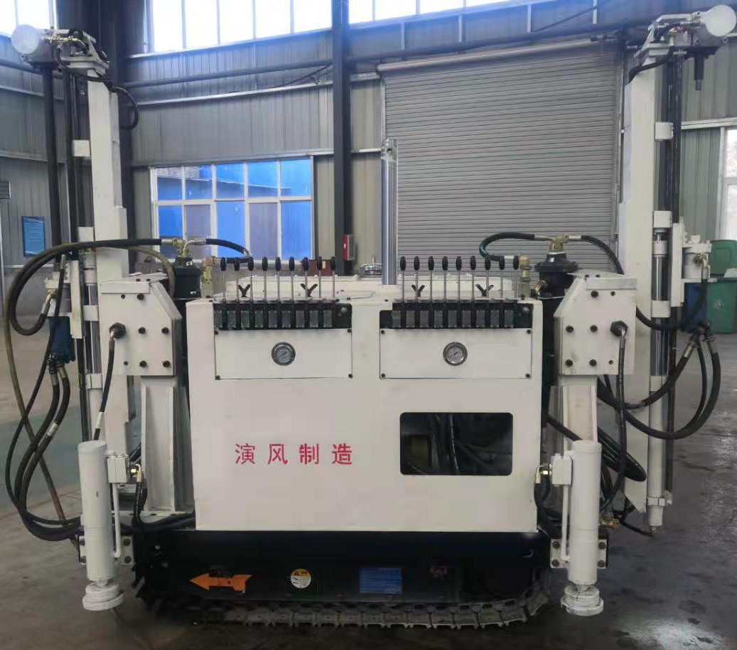 切頂鉆機(jī)采用底部四根支撐油缸,支撐切頂鉆機(jī)底部,將切頂鉆機(jī)底板調(diào)平;車體中間有頂部支撐油缸,與底部四根支撐油缸配合,將切頂鉆機(jī)固定在巷道內(nèi);給進(jìn)與起拔力大,提高了鉆機(jī)處理卡鉆事故的能力;采用雙動(dòng)力頭系統(tǒng),動(dòng)力頭間距大可調(diào)200mm,可適應(yīng)孔距為500、600、700(mm)的鉆孔工作,提高了切頂鉆機(jī)的工作效率;液壓原件采用先進(jìn)定制產(chǎn)品,性能穩(wěn)定,通用性強(qiáng),質(zhì)量可靠。